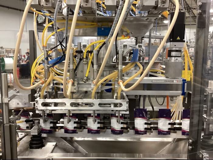 The IMTN5 Pouchmaster is a flexible machine engineered for high-speed filling of liquid products into pouches with a top die cut. It can produce gusset bottom pouch sizes ranging from 2” x 2” to 3.75” x 9.5”, at a rate of 110 parts per minute.